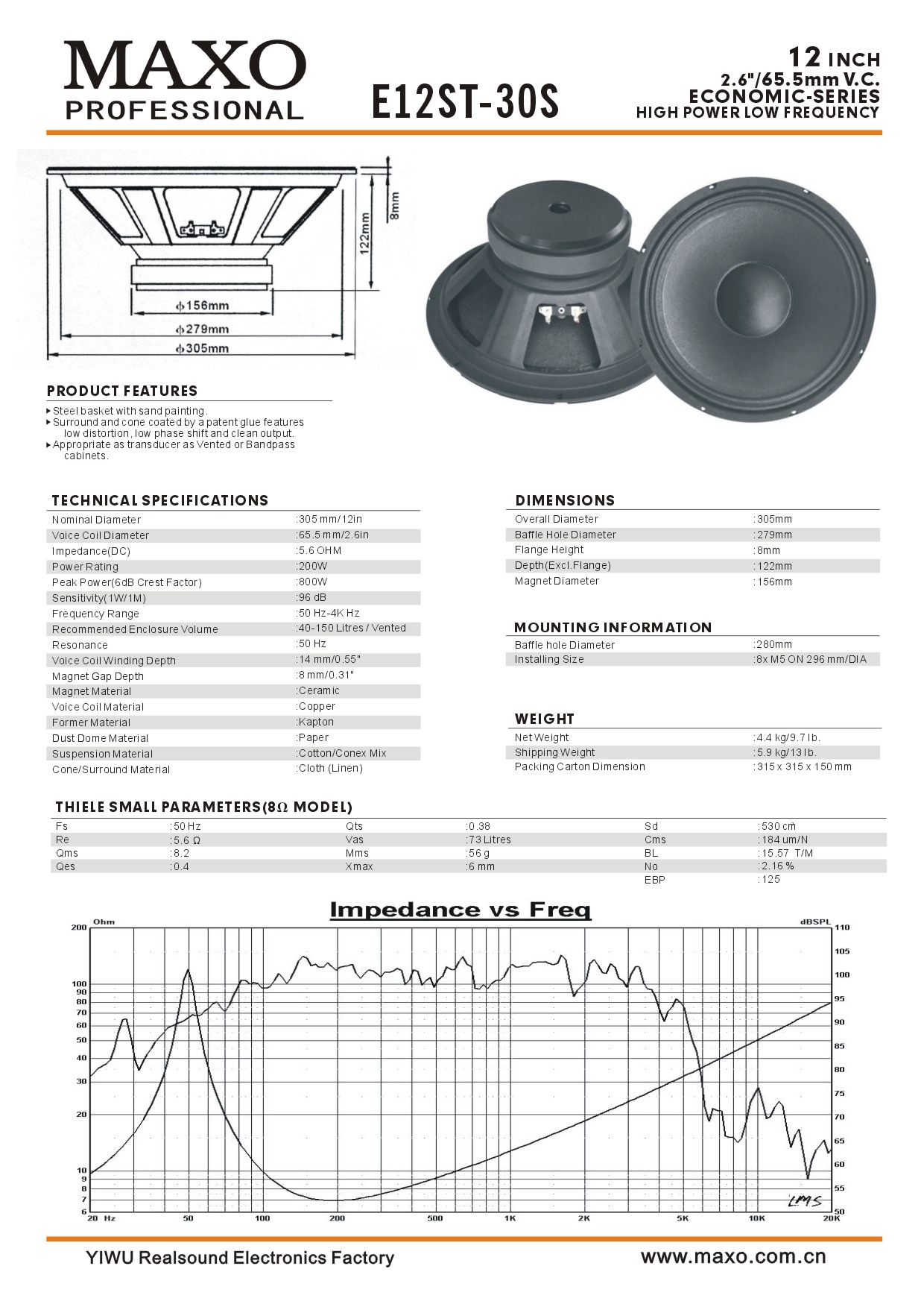 | 305mm/12in | 200W | 65.5mm/2.6in | 96db |