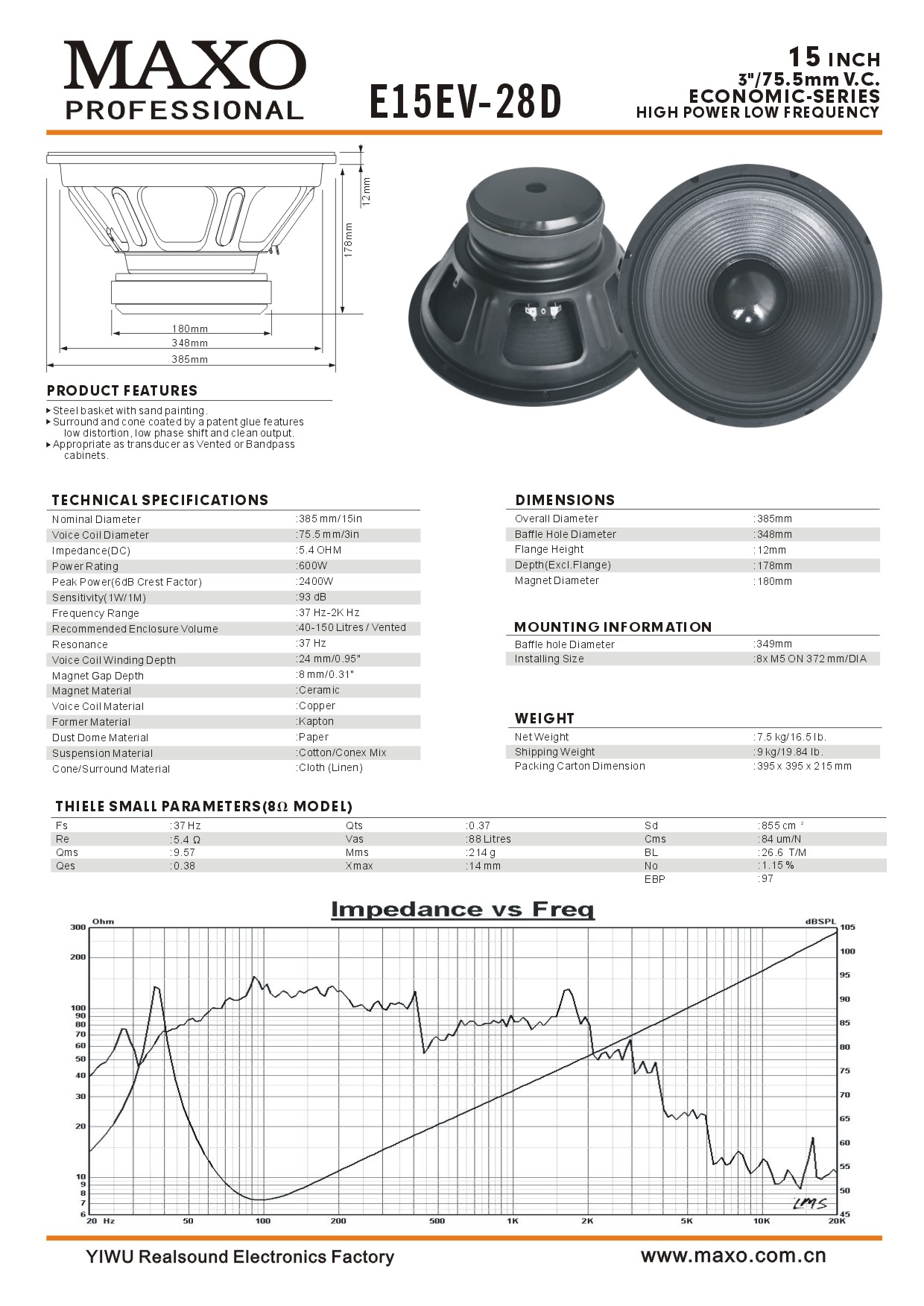 | 385mm/15in | 600W | 75.5mm/3in | 93db |