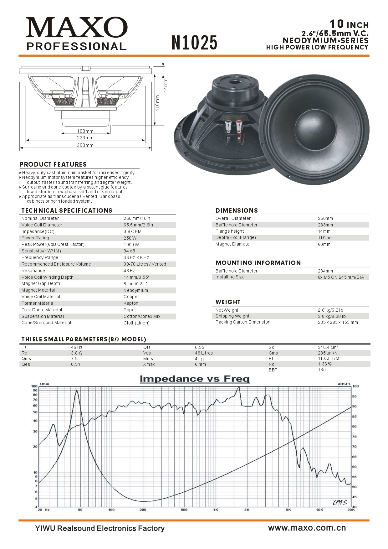 | 260mm/10in | 250W | 65.5mm/2.6in | 94db |