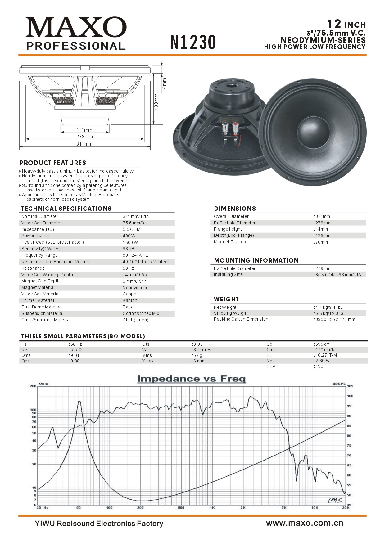 | 311mm/12in | 400W | 75.5mm/3in | 96db |