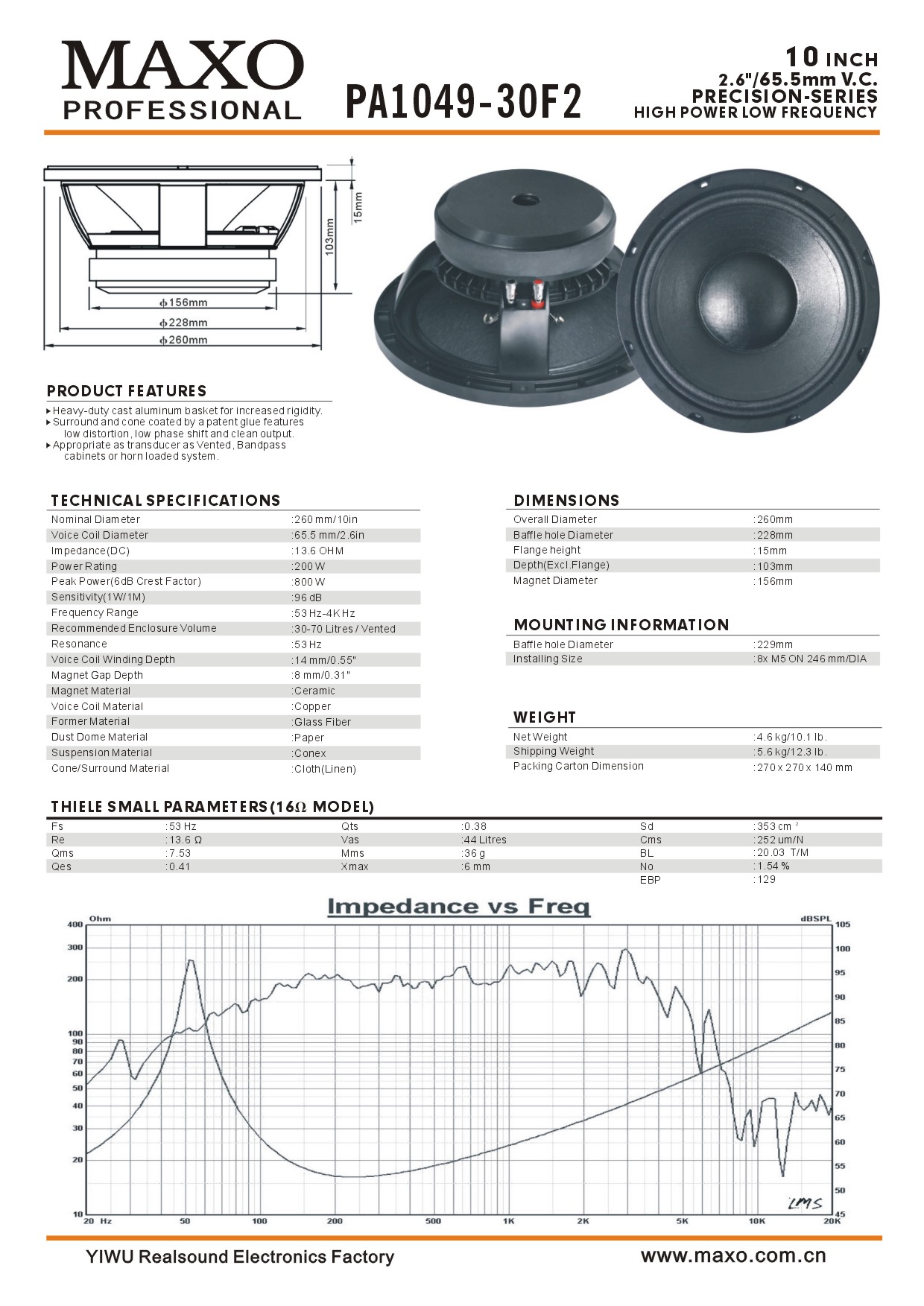 | 260mm/10in | 200W | 65.5mm/2.6in | 96db |