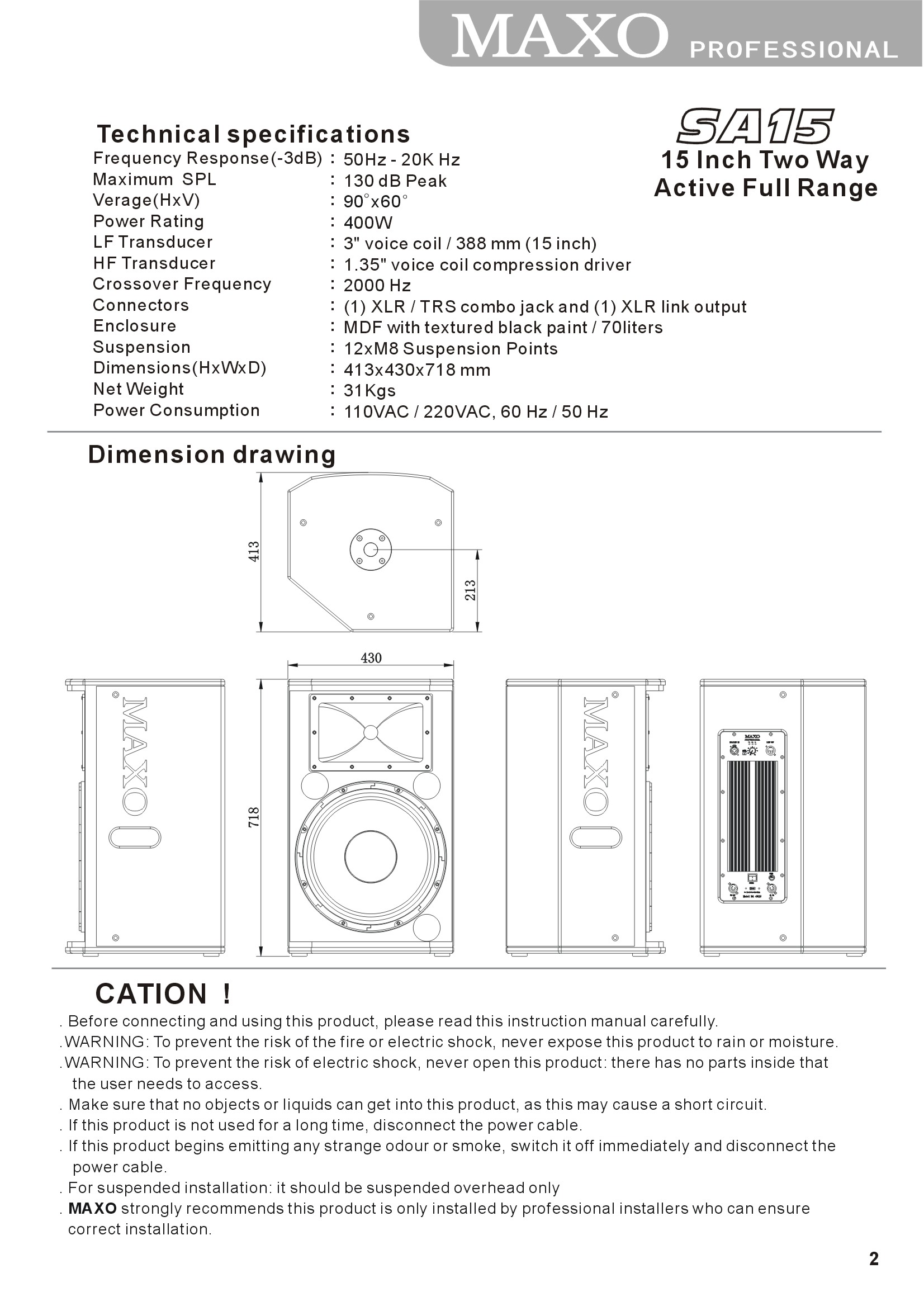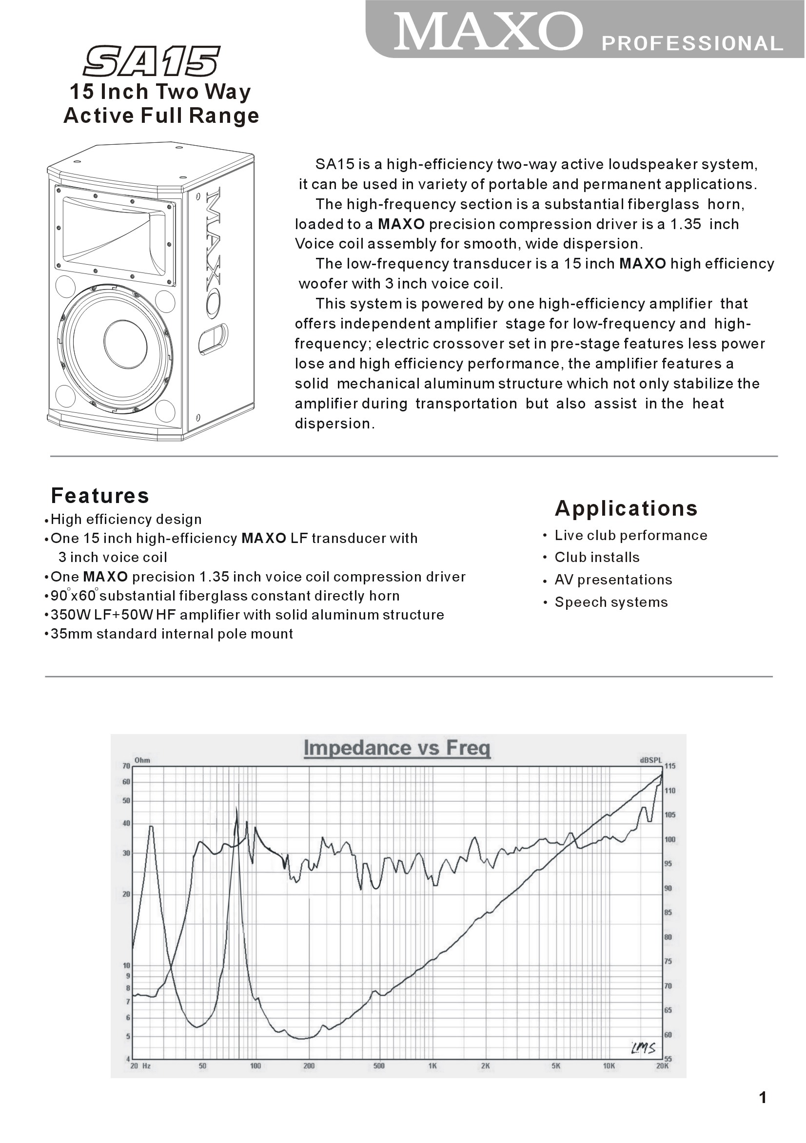 | LF Transducer | : | 3″ voice coil / 388 mm (15 inch) |